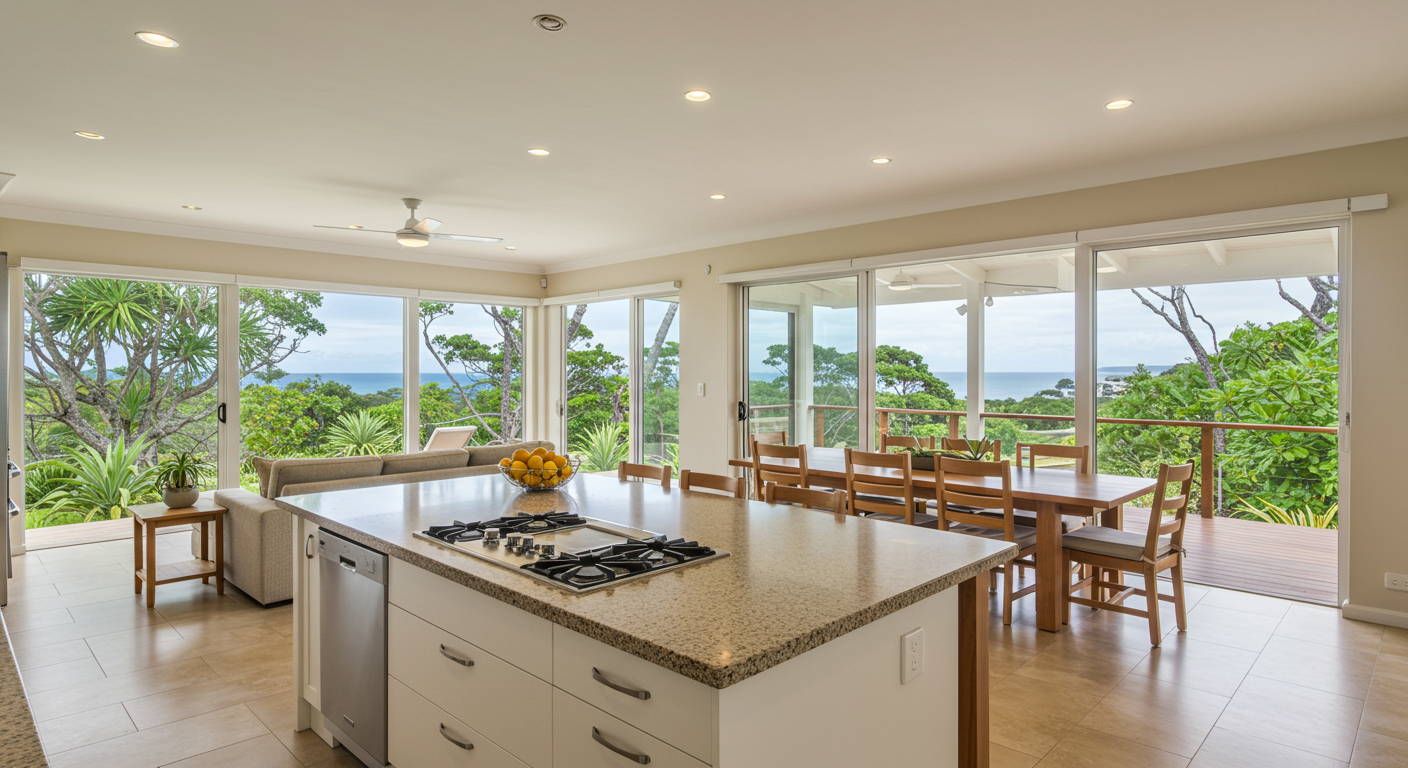Completing the heart of the home, the bright and airy kitchen and formal dining space also boast stunning ocean views where whales can be seen playing in the winter waves below.