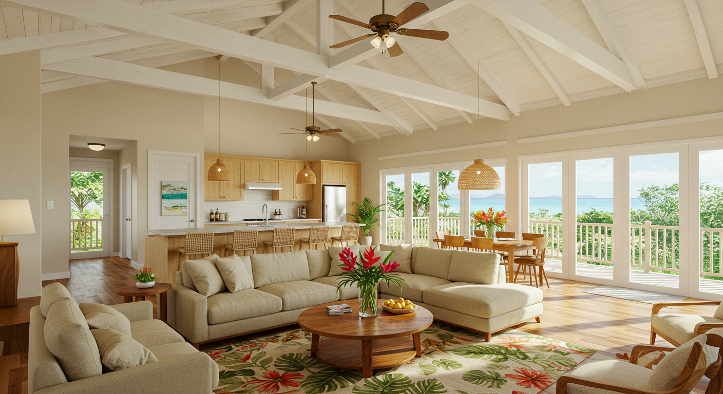 Tucked towards the end of a very quiet cul-de-sac, this cute Kauai home is being offered fully furnished and turn-key. As you enter the home from the main entry, you are greeted by an open floor plan with 15' vaulted ceilings.